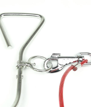 Deze super handige grond pen is gemaakt van ijzer en u draait hem makkelijk in de grond. De staalkabel (lijn) is 5 meter lang en u kan uw hond of puppy (of ander dier) makkelijk vastzetten met de karabijn haak die vast zit aan de lijn. U draait de pen in de grond en zet uw hond vast, zo kan uw hond makkelijk bewegen maar niet weglopen dit is ook erg fijn op vakantie. Kortom het ideale product om uw hond bewegingsruimte te bieden.