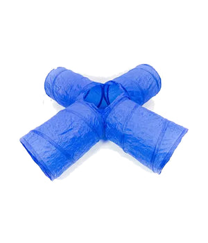 Leuke blauw nylon tunnel in kruis uitvoering. Ideaal om de Agility skills van je viervoeter thuis te oefenen.
