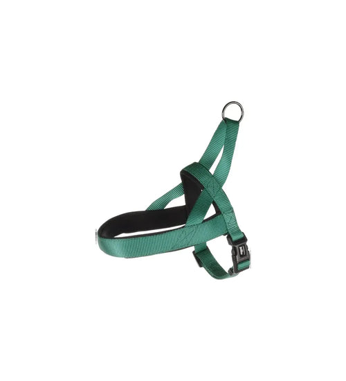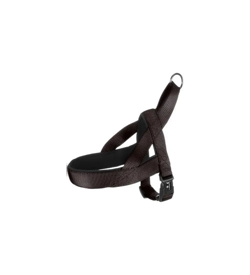 Dit tuigje is bijzonder eenvoudig om te doen: je schuift het gewoon over de kop van je hond en klikt de sluiting vast – je hond hoeft er niet in te stappen. Het is gemaakt van stevig nylon met een zachte binnenvoering en traploos verstelbaar voor een perfecte pasvorm. De handige kliksluiting maakt het aan- en uittrekken snel en gemakkelijk, terwijl de metalen D-ring met glanzende donkergrijze afwerking zorgt voor een veilige bevestiging van de hondenlijn. Voor extra controle is het tuigje uitgerust met een handvat. Beschikbaar in maat M (A: 45 cm, B: 50–65 cm, 20 mm × 3 mm) en verkrijgbaar in diverse kleuren.