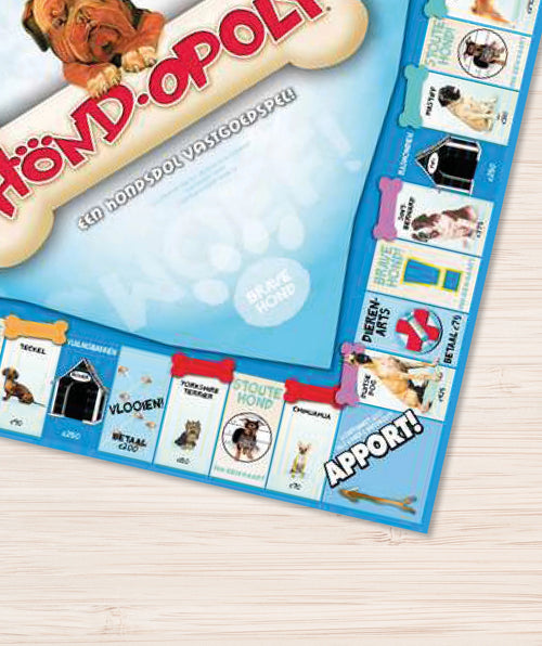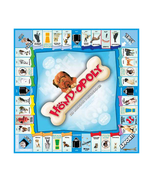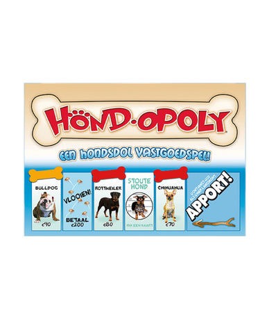 Hond.opoly is een bordspel gebaseerd op het bekende vastgoedspel, maar volledig in hondenthema. In plaats van straten koop je hondenrassen, verzamel je speeltjes en probeer je als laatste speler met “botten” over te blijven.