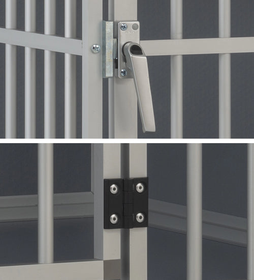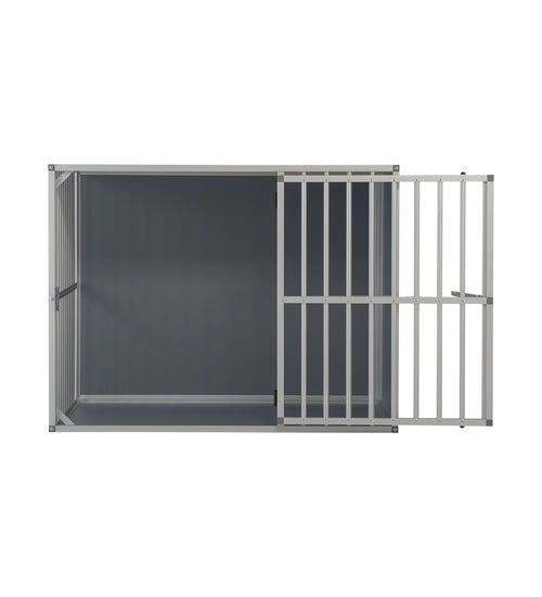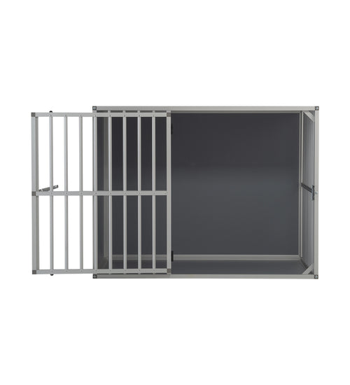 De deur van deze bench bevindt zich in de lange wand. De draai richting van de deur kan naar links of naar rechts. Het hang en sluitwerk is van degelijk ijzer. Door het plaatsen van een deuraanslag kan de deur van de kooi nooit naar binnen in de bench vallen. Daarnaast is de grendel van de bench voorzien van een drukknop, zo kan de hond nooit uit zichzelf de bench openen.