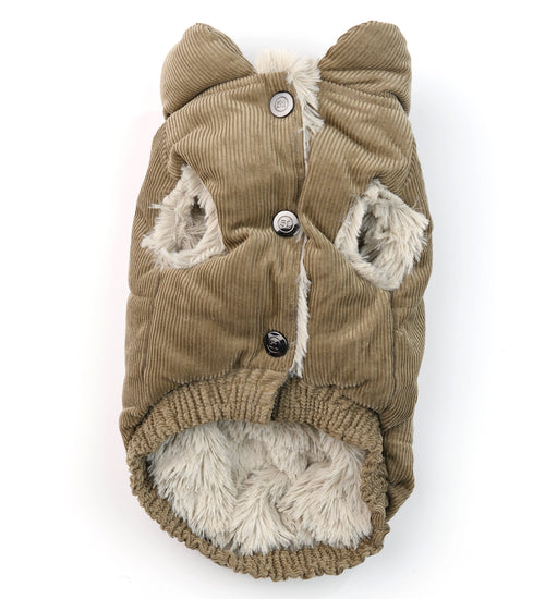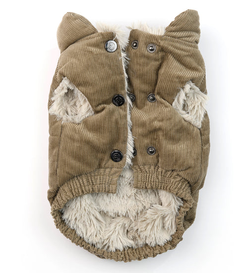 Deze 51 Degrees North Hondenjas 51 Velours beige is heerlijk zacht en warm. Deze hondenjas met een perfecte pas vorm is ideaal voor honden die gevoelig zijn voor ons koude klimaat of moeite hebben zichzelf warm te houden. De stof van dit hondenkleding stuk bestaat katoen met een polyester vulling. Door de elastische boorde en ander elastisch materiaal sluit deze hondenjas bij de meeste honden perfect aan om het lichaam, zo komt er geen tocht binnen in de jas. Dit maakt de hondenjas perfect voor koud en slecht weer. De hondenjas wordt met degelijke drukknopen onder de borst vastgezet. Wordt de jas vies: Je kan hem gemakkelijk uitwassen op 30 graden.