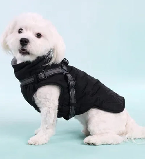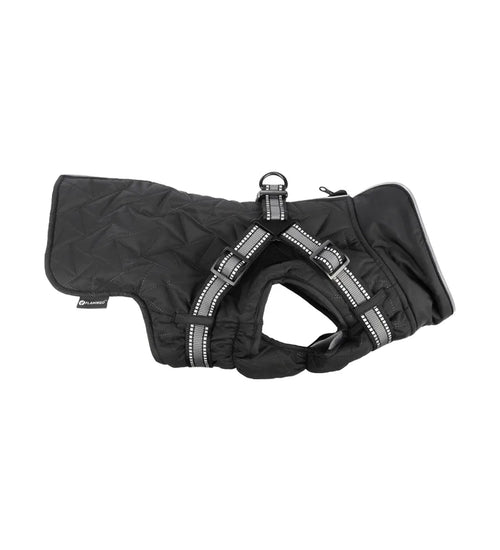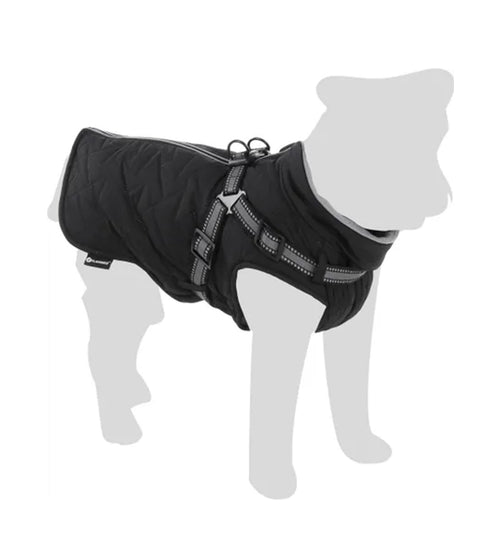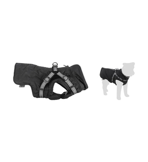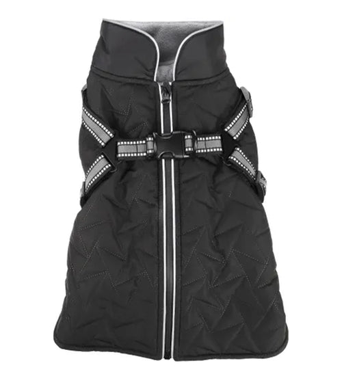 Wat deze jas echt bijzonder maakt, is het traploos verstelbare tuigje dat is ingebouwd in het ontwerp. Het tuigje heeft een handige kliksluiting en is voorzien van twee ringen voor trekontlasting, waardoor de druk op het slot vermindert en je hond veilig en comfortabel blijft tijdens elke wandeling.