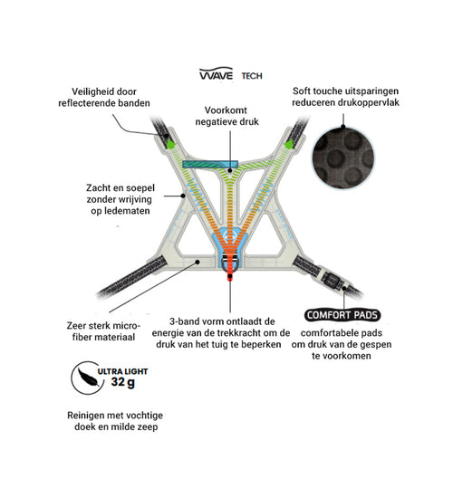 Vervaardigd uit ultralicht maar ongelooflijk duurzaam microvezelmateriaal, biedt dit vest uitzonderlijke sterkte zonder in te leveren op comfort. Het interieur is bekleed met zachte aanraakpanelen, waardoor de wrijving tegen de huid van je hond verder wordt verminderd.