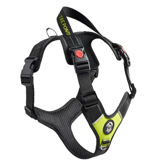 Het Tre Ponti Harmonia tuig is voorzien van een stevige handgreep op de rug en twee bevestigingspunten: één vaste ring op de rug en één anti-trekring op de borst. Deze dubbele lijnoptie biedt extra controle tijdens het wandelen. Reflecterende details aan de voorkant en op de handgreep zorgen voor extra zichtbaarheid bij schemer en avondwandelingen.