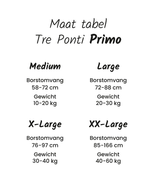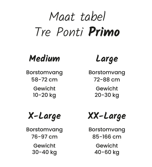 Maten en afstelling: De Primo tuigen zijn beschikbaar in 4 maten: M, L, XL en XXL. Het is belangrijk om het tuig strak af te stellen, waarbij de buiksingel minstens één tot twee centimeter vrij moet zijn van de oksels. Het tuig moet zijdelings mee kunnen bewegen met de ruimte die de huid toelaat, zonder vrij over de vacht te schuiven. Pas wanneer de huid geen ruimte meer biedt, mag het tuig over de vacht glijden. Zorg ervoor dat het tuig nooit te los zit, omdat dit oncomfortabel is voor de hond en het wandelplezier kan verminderen. Laat voldoende ruimte over zodat de borstkas kan uitzetten tijdens activiteiten. De Primo tuigen bieden de hond veel bewegingsvrijheid zonder blokkades bij de schouders. Het ontwerp zorgt ervoor dat de hond wordt beloond met extra ruimte rond de voorband wanneer hij ontspannen staat of loopt, maar zodra de lijn wordt aangespannen, sluit de band weer keurig aan.