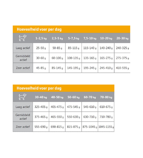 | Voedingsadvies | Volg het voedingsschema in de tabel, maar pas eventueel het schema aan om het ideale gewicht van je hond te handhaven. verdeel de dagelijkse hoeveelheid voer over twee of meer maaltijden per dag. houd de conditie van je hond steeds goed in de gaten en zor |