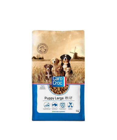 Evenwichtige voeding vormt, met name bij middelgrote tot grote rassen, een belangrijke basis voor jonge opgroeiende honden. CaroCroc Puppy Large verzekert je van een goede groei en ontwikkeling van uw hond. Het bevat alle bouwstoffen, in de juiste verhouding, die je pup of jonge opgroeiende hond nodig heeft.