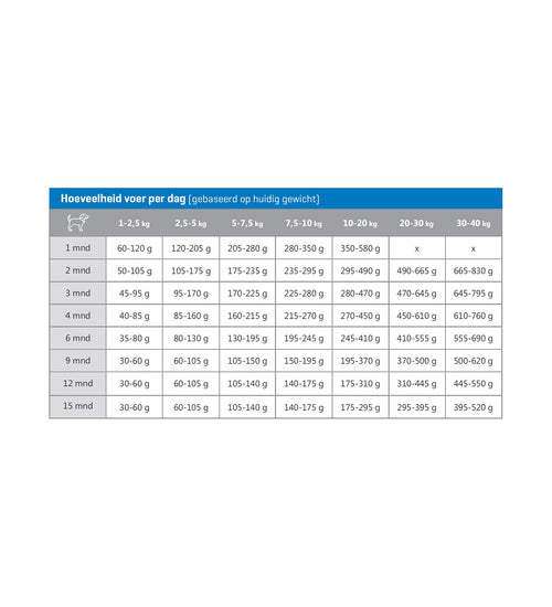 VoedingsadviesVolg het voedingsschema in de tabel, maar pas eventueel het schema aan om het ideale gewicht van je hond te handhaven. verdeel de dagelijkse hoeveelheid voer over twee of meer maaltijden per dag. houd de conditie van je hond steeds goed in de gaten en zor
