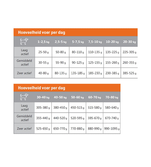 | Voedingsadvies | Volg het voedingsschema in de tabel, maar pas eventueel het schema aan om het ideale gewicht van je hond te handhaven. verdeel de dagelijkse hoeveelheid voer over twee of meer maaltijden per dag. houd de conditie van je hond steeds goed in de gaten en zor |
