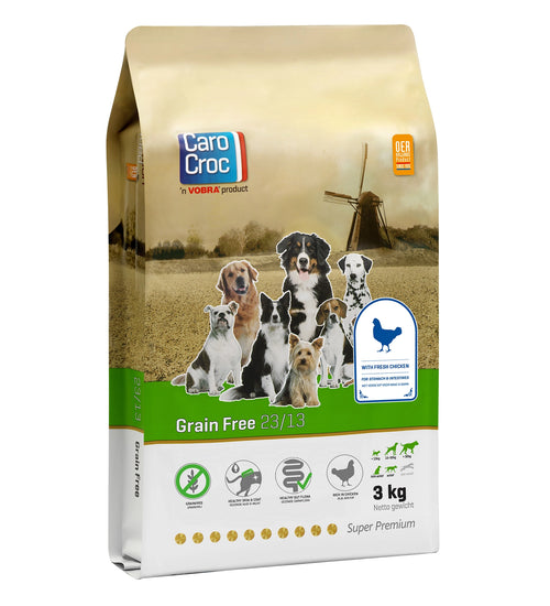CaroCroc Grain Free 23/13 is een complete graanvrije voeding met verse kip voor volwassen honden van alle rassen en biedt een perfecte ondersteuning bij voedselallergieën. Ook draagt het bij aan het voorkomen van voedselovergevoeligheid. CaroCroc graanvrij hondenvoer is bovendien rijk aan gevogelte en aardappel.