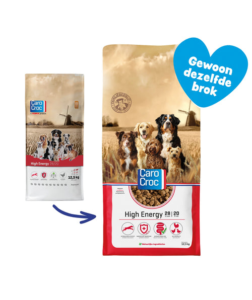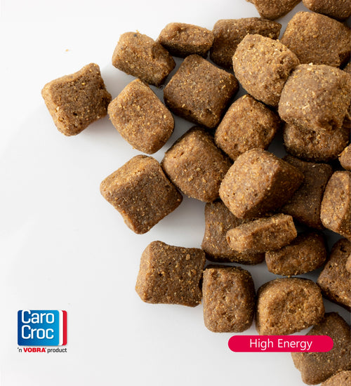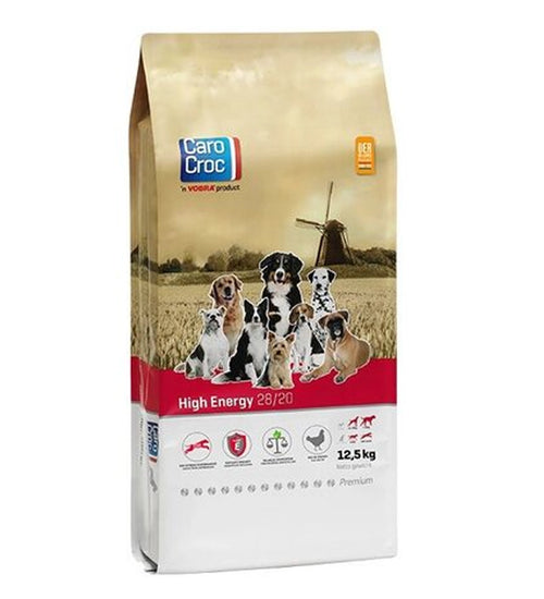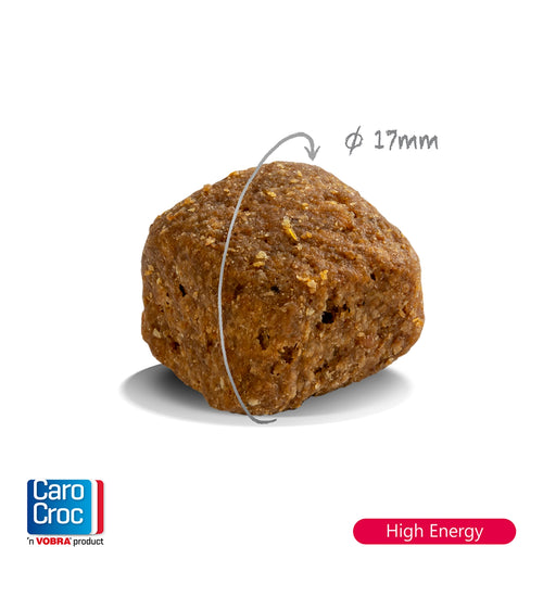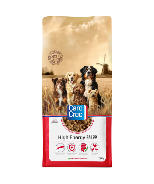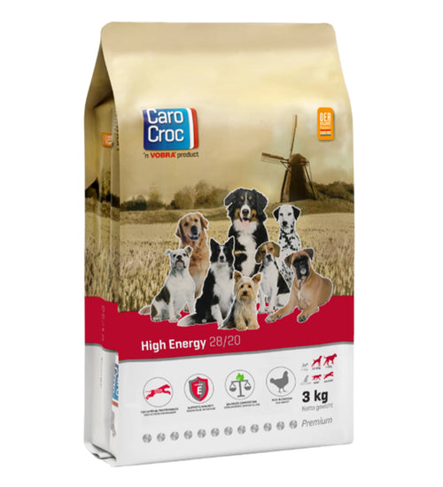 De CaroCroc High Energy brokken zijn speciaal samengesteld voor honden die extreme inspanning leveren. Dit wil zeggen dat zij meer dan 3 uur per dag intensief bewegen. Door het hoge eiwit- en vetgehalte kan jouw hond vol energie bewegen.