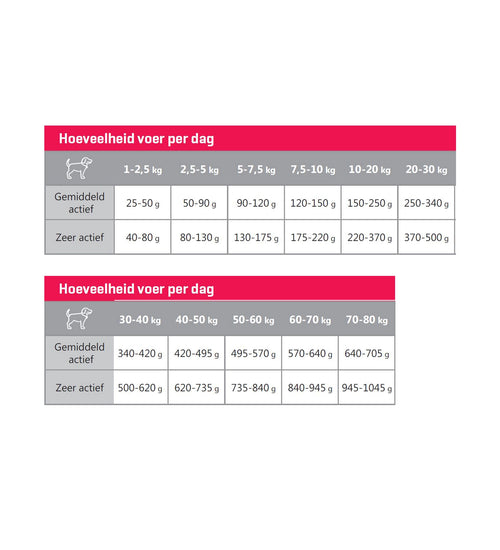 | Voedingsadvies | Volg het voedingsschema in de tabel, maar pas eventueel het schema aan om het ideale gewicht van je hond te handhaven. verdeel de dagelijkse hoeveelheid voer over twee of meer maaltijden per dag. houd de conditie van je hond steeds goed in de gaten en zor |