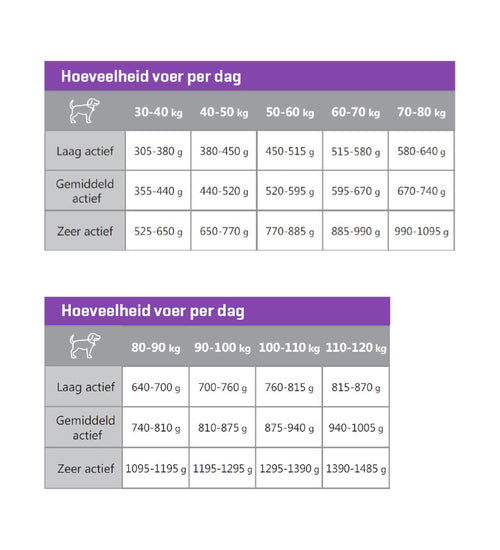 | Voedingsadvies | Volg het voedingsschema in de tabel, maar pas eventueel het schema aan om het ideale gewicht van je hond te handhaven. verdeel de dagelijkse hoeveelheid voer over twee of meer maaltijden per dag. houd de conditie van je hond steeds goed in de gaten en zor |