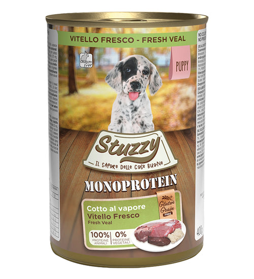 Stuzzy Hondenvoer Paté Monoprotein Kalfsvlees 400g Puppy – hoogwaardige monoprotein natvoeding voor jonge honden.
