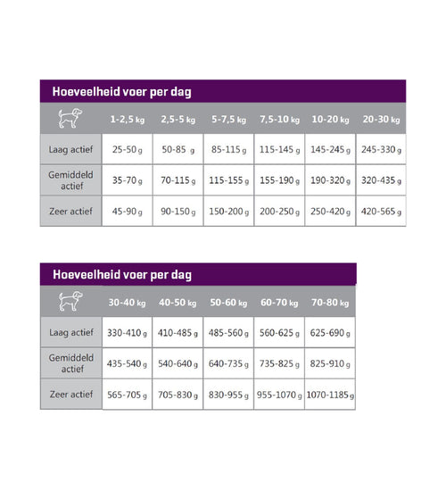 | Voedingsadvies | Volg het voedingsschema in de tabel, maar pas eventueel het schema aan om het ideale gewicht van je hond te handhaven. verdeel de dagelijkse hoeveelheid voer over twee of meer maaltijden per dag. houd de conditie van je hond steeds goed in de gaten en zor |