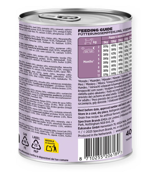 Het natvoer is gebaseerd op kip als hoofdingrediënt, verrijkt met rund als aanvullende eiwitbron en aangevuld met pompoen. Zalmolie levert waardevolle omega-3-vetzuren en het vezelrijke recept ondersteunt een gezonde spijsvertering. Dankzij het uitgebalanceerde calciumgehalte draagt deze maaltijd bij aan een gezonde groei en botontwikkeling.