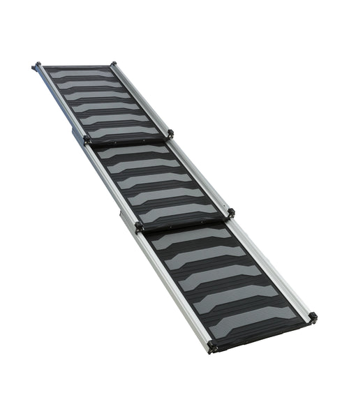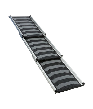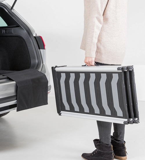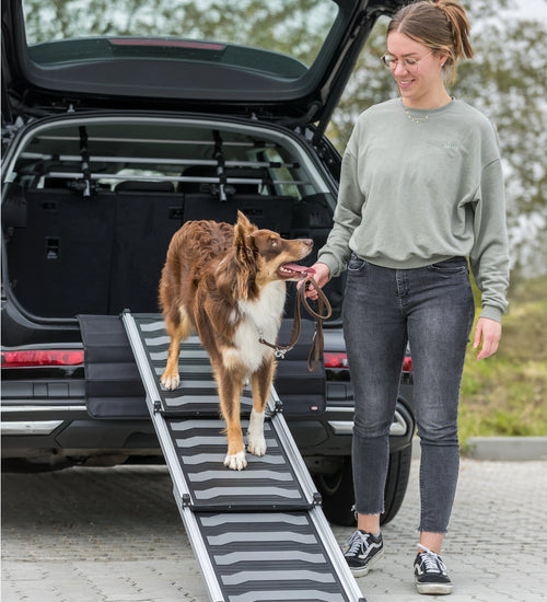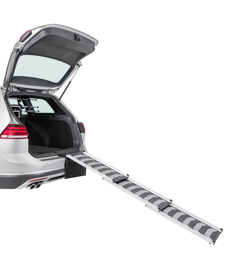 Deze super lichtgewicht aluminium hondenloopplank helpt u bij het voorkomen van klachten bij uw hond en bij uzelf. Het is erg slecht voor uw rug om steeds uw hond op te pakken en deze in de auto te zetten. Terwijl in en uit de auto springen voor oudere honden steeds ingewikkelder wordt en een aanslag op de gewrichten is. Sommige honden vinden dit ook eng. Om uw hond en u te helpen, hebben wij nu deze telescopische loopplank in ons assortiment opgenomen.