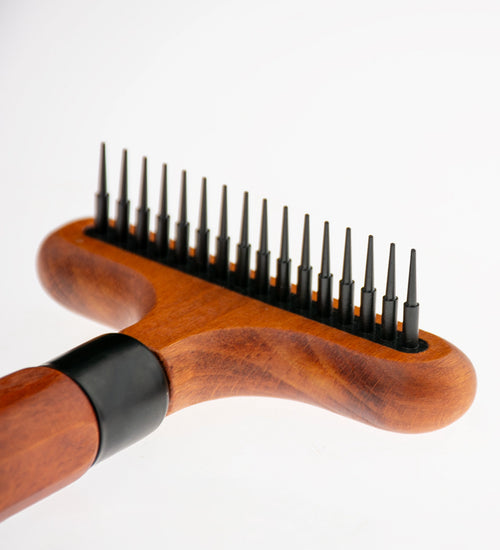 De NOIR Japandi Ontrafelhark is ontwikkeld om losse haren en dode ondervacht efficiënt te verwijderen. De hark is bijzonder geschikt voor gebruik tijdens de ruiperiode, wanneer honden en katten veel ondervacht verliezen. Door regelmatig gebruik blijft de vacht luchtig en wordt klitvorming verminderd.