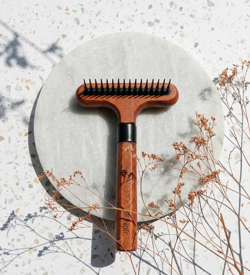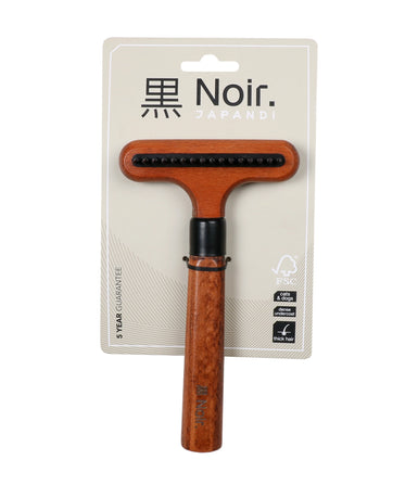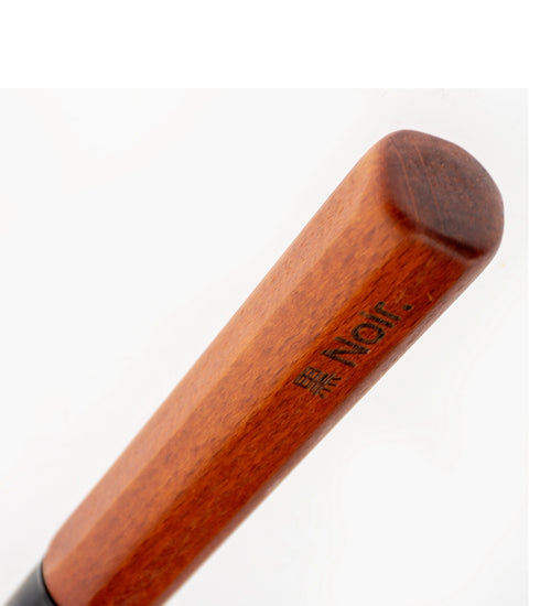 Het ergonomische handvat van beukenhout met een donker gebeitste afwerking zorgt voor een comfortabele grip en controle tijdens het verzorgen. De combinatie van duurzame materialen en een minimalistisch ontwerp past binnen de Japandi-stijl van de Noir verzorgingslijn.
