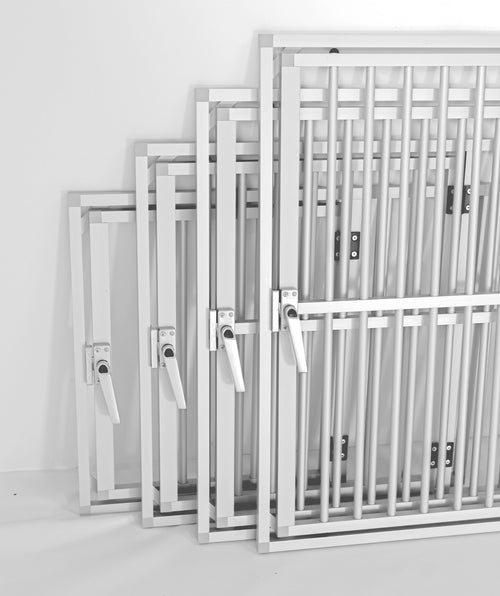 De panelen zijn verkrijgbaar in vier maten (S, M, L en XL) en zijn voorzien van een deur met grendel. Met een spijldikte van 16 mm en een spijlafstand die varieert van 4,5 cm tot 5,5 cm, zijn de panelen stevig en veilig voor verschillende hondenrassen. De panelen zijn los inzetbaar, waardoor je flexibel een eigen bench of ren kunt maken.