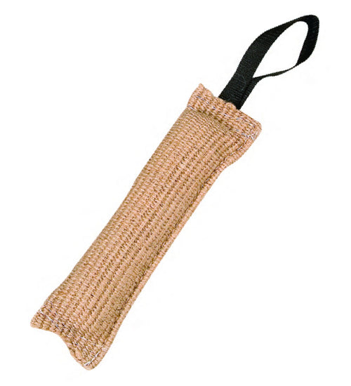 De dummy is gemaakt van sterk jute en gevuld met katoen, waardoor hij zowel duurzaam als comfortabel in de bek van je hond ligt. De afwerking met bies zorgt voor extra stevigheid. Met het handvat gooi je de dummy eenvoudig weg en daag je je hond uit om hem terug te brengen. Verkrijgbaar in twee maten: