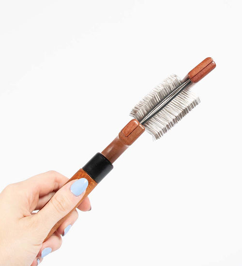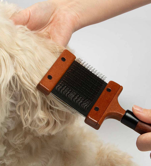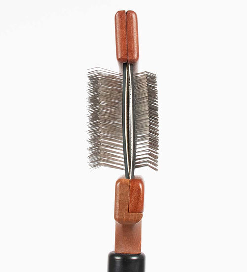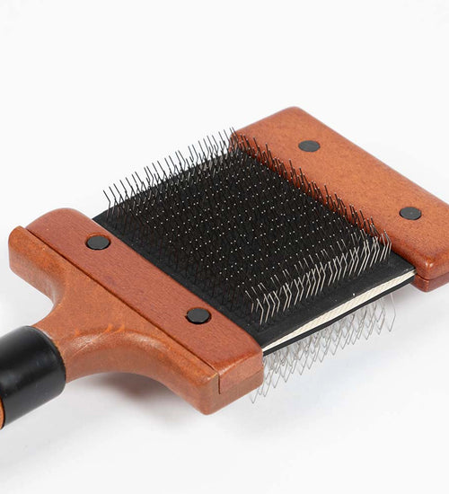 Met deze dubbelzijdige slickerborstel kies je voor een verzorgingshulpmiddel dat functionaliteit en uitstraling combineert. De combinatie van korte en lange pinnen, de flexibele kop en het comfortabele houten handvat maakt deze borstel geschikt voor de dagelijkse vachtverzorging van honden en katten.