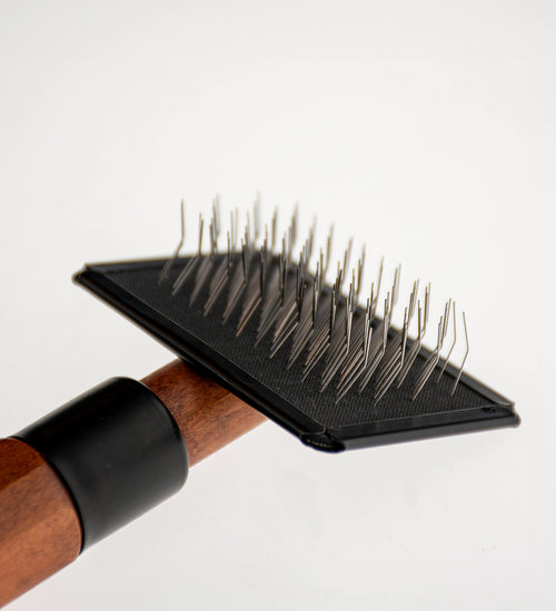 De NOIR Japandi Slickerborstel is een veelzijdige borstel voor de dagelijkse vachtverzorging van honden en katten. De borstel is uitgerust met fijne, gebogen roestvrijstalen pinnetjes die losse haren, vuil en beginnende klitten effectief uit de vacht verwijderen. Regelmatig borstelen helpt de vacht gezond, glanzend en klitvrij te houden.