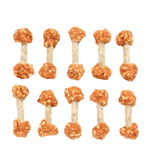 De halters bevatten geen toegevoegde suikers en hebben een stevige structuur die bijdraagt aan het kauwplezier van je hond. Ze zijn verpakt in een praktische zak van 150 gram en geschikt voor honden van verschillende rassen en groottes.
