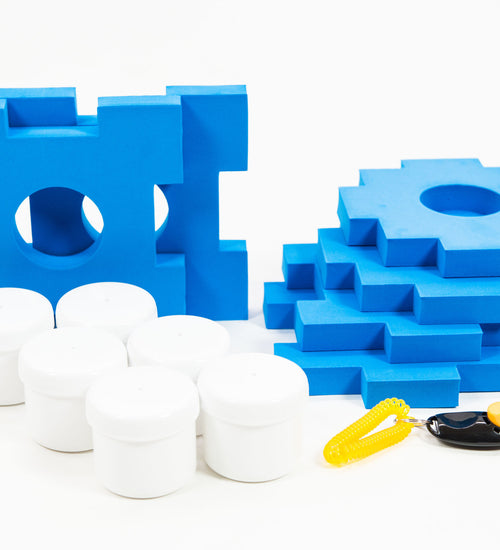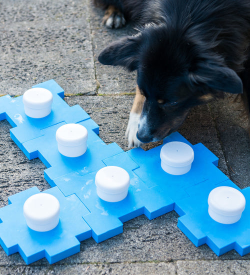 Als uw hond de bovenstaande stappen beheerst, kunnen we de puzzel stukken erbij gaan gebruiken en het commando ('zoek'). U kunt dan alle voorgaande stappen herhalen.