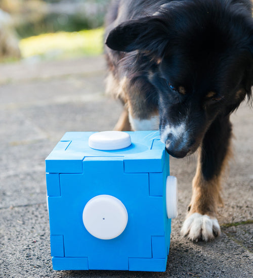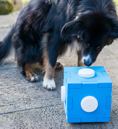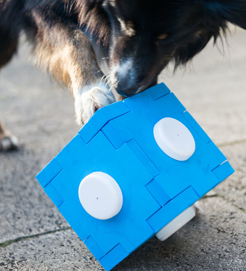 Gaat dat goed dan kunt u de puzzelstukken ook als kubus gaan gebruiken, waarbij uw hond de juiste doos boven moet gaan krijgen.