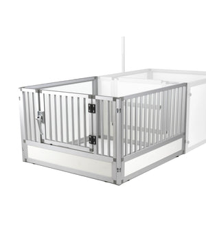 Deze uitloopren bestaat uit 3 panelen van 80 cm breed en 50 cm hoog, die u aan uw werpkist kunt koppelen. Optioneel zijn er 2 extra panelen als uitbreiding bij te bestellen. Klik hier