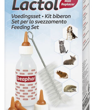 Set met drinkflesje, speentjes en schoonmaakborstels voor pups en kittens en andere opgroeiende huisdieren. De Beaphar Set is uitstekend geschikt voor het grootbrengen van pasgeboren en opgroeiende huisdieren. Ook kan het als hulpmiddel dienen bij de voedselopname van zieke en herstellende dieren. De set bestaat uit een drinkflesje, een aantal speentjes en een schoonmaakborsteltje. Beaphar heeft verschillende moedermelkvervangers zoals Lactol PuppyMilk, KittyMilk en Knaagdier- en konijnenmelk. Deze zijn op aanvraag te bestellen.