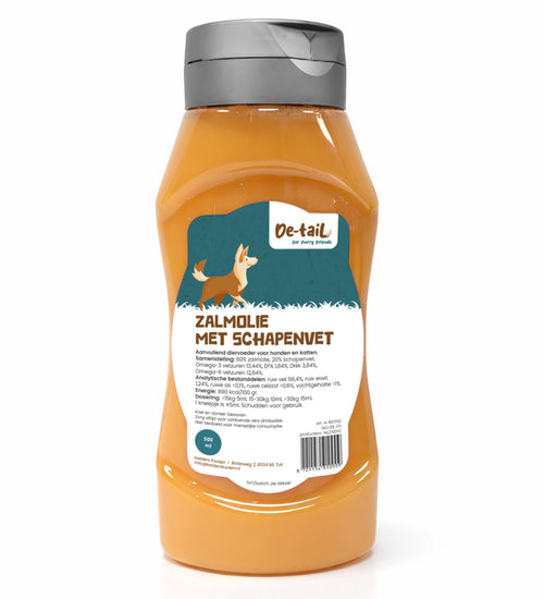 Deze aanvullende voeding voor honden en katten combineert hoogwaardige zalmolie 80% met schapenvet 20% voor een dagelijkse ondersteuning van huid, vacht, spijsvertering en algehele vitaliteit. De natuurlijke mix van Omega-3 en Omega-6 vetzuren draagt bij aan een gezonde huidbarrière, een glanzende vacht en een goede weerstand. Dankzij de smaak van schapenvet is dit product bovendien zeer geschikt voor kieskeurige eters.